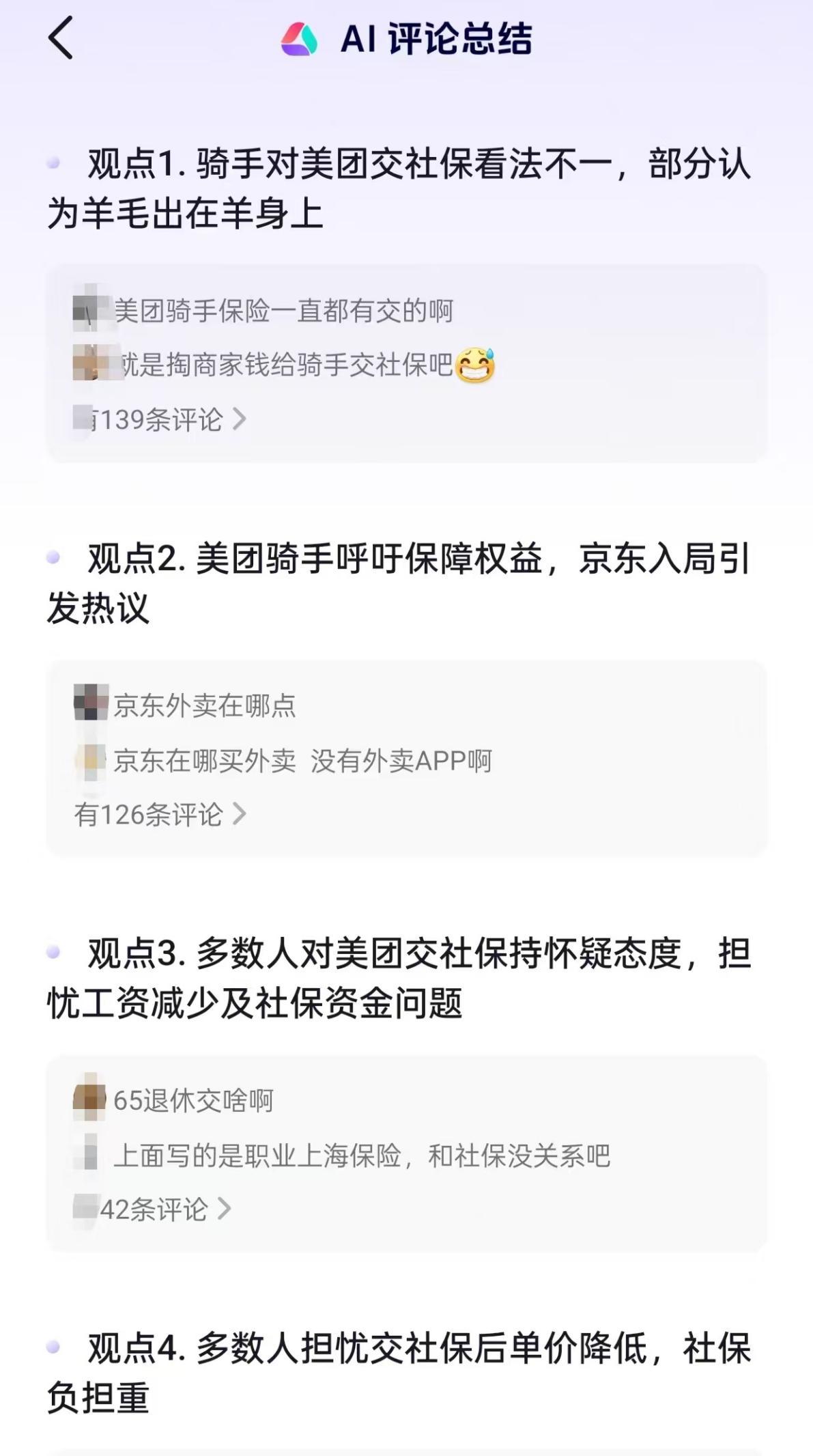 图片:滕野发布短片讨论送货员的社会保障问题,评论区AI给出4点总结。