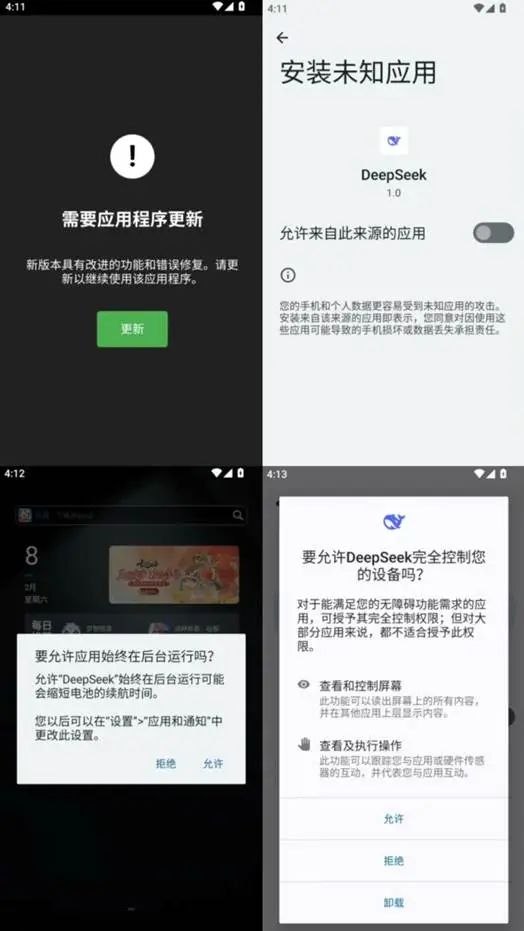引导顾客“更新”(左上)、引导顾客安装“带毒”子安装包(右上)、后台程序(左下)诱导用户授权、通过使用无障碍功能(右下)来诱导用户。