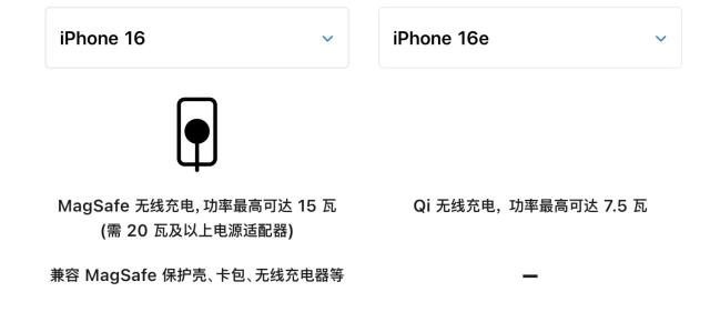 不可理解的是,iPhone 16e 虽然支持无线充电,并不支持 MagSafe,也就是说,无线充电功率不能使用磁吸生态配件,最高只有 7.5 瓦。