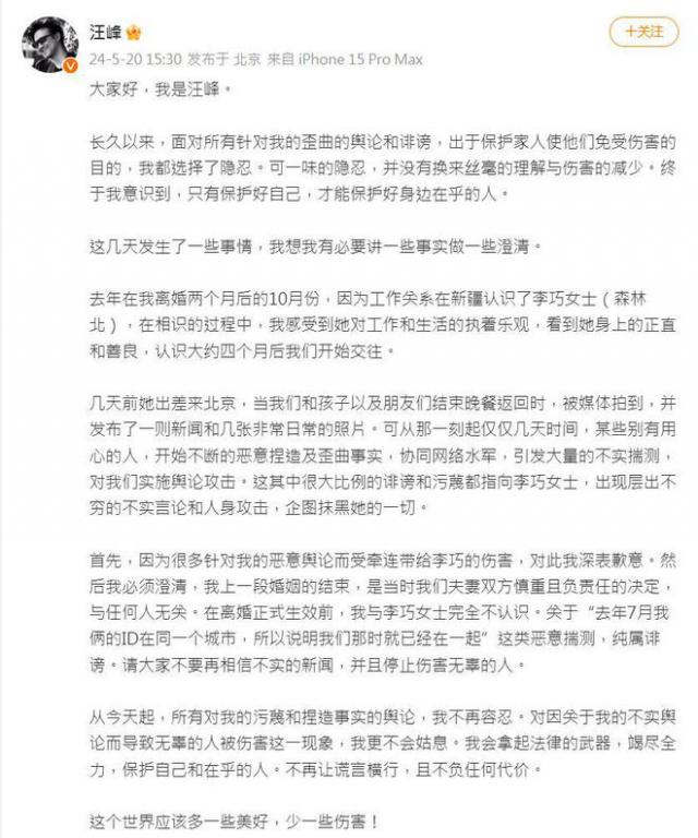 2024 年 5 月 20 日,汪峰正式宣布与森林北的恋情。
