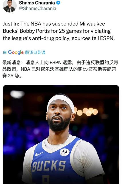 据 nba “爆料大王” Shams Charania 据透露,密尔沃基雄鹿队 30 岁前峰鲍比 · 由于违反联盟反毒品禁令,波蒂斯将被禁赛。 25 场。