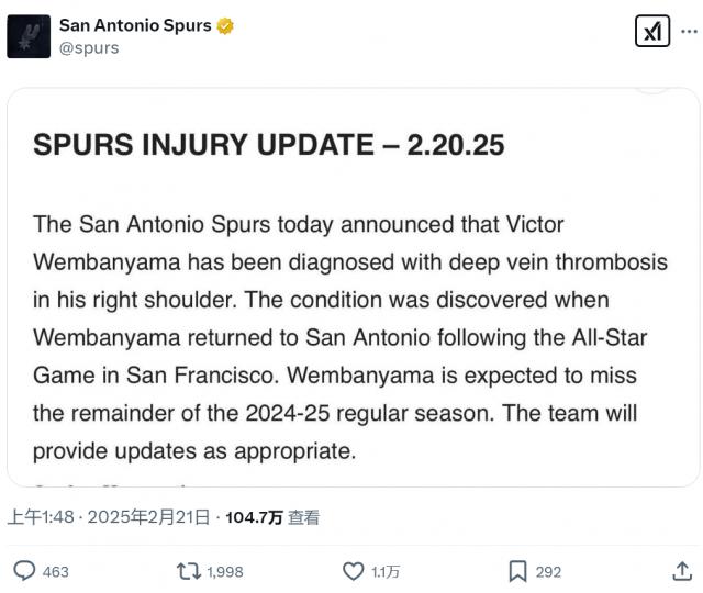 北京时间 2 月 21 日凌晨 1 点 48 分,马刺官方宣布:维克托 - 文班亚马被发现右肩深静脉血栓,预计缺阵。 2024-25 赛季常规赛剩下的比赛。参加过旧金山全明星的文班亚马,回到圣安东尼奥后确诊。血栓问题可以大也可以小,希望文班没事!