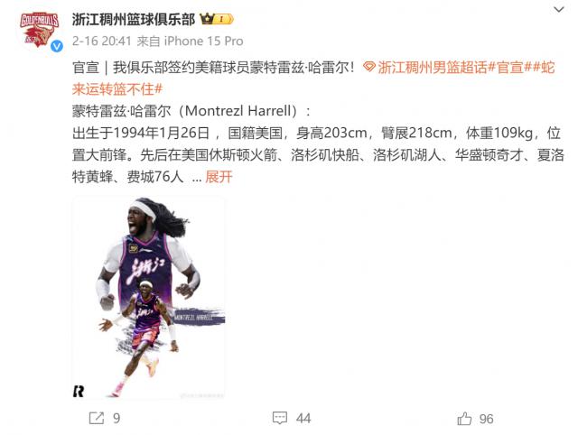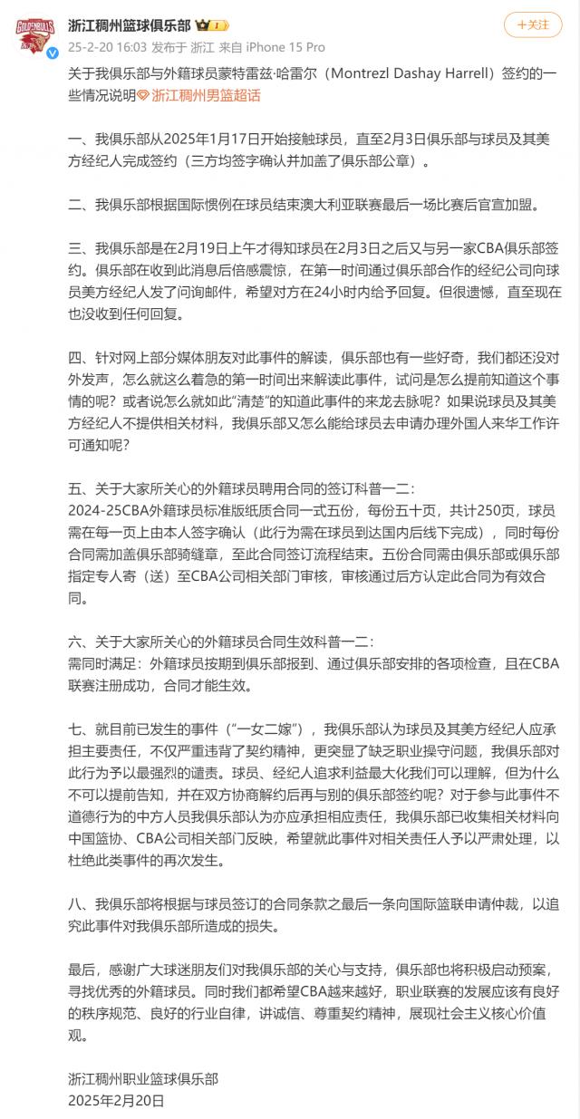 北京时间 2 月 20 日下午,CBA 浙江男篮发表声明:我的俱乐部 2025 年 1 月 17 接触哈雷尔的日子开始了,后者是 2 月 3 日后又和另一个人在一起 CBA 俱乐部签约。哈雷尔涉嫌“一女二嫁”,他和美国经纪人负有主要责任,浙江男篮将为国际篮联申请仲裁。