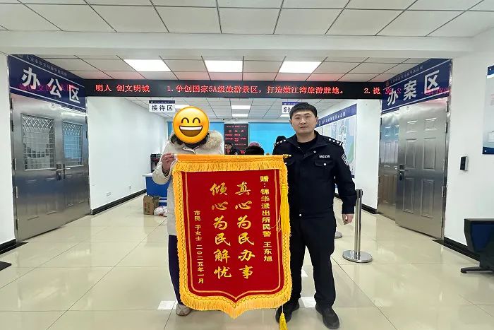 几天后,于女士感激地向锦华派出所民警送去了一面印有“真心为民办事,倾情为民解忧”的横幅,表达了对民警高效出警、热情为民的深深感谢!
