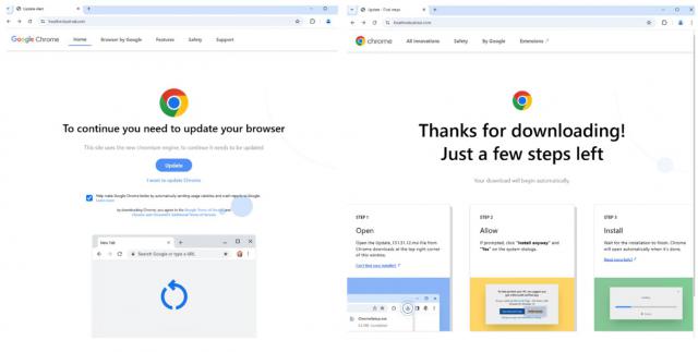 报告指出 TA2726 和 TA2727 两个黑客组织打扮成浏览器更新,诱骗用户下载恶意程序。在访问感染网站后,用户会被提醒更新虚假浏览器。