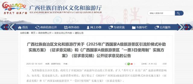 近日,广西文化旅游厅发文称,计划实施我国 A 一级旅游景点"一票 3 日常使用制”。对于国家 A 一级旅游景点引流阶梯式补贴,并公开征求社会意见。(详情请点击:广西日报)