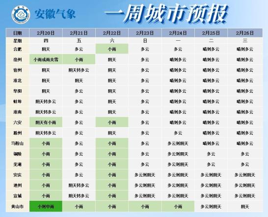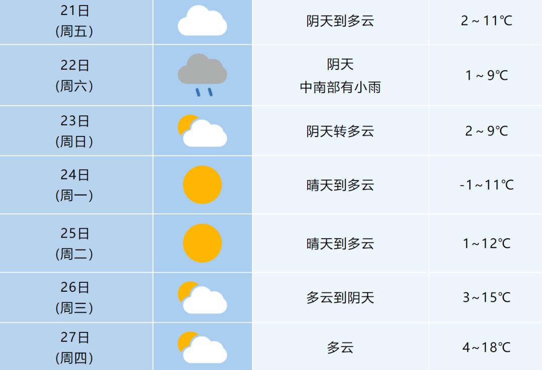 21日(周五):全省阴天转多云,淮北北部、大别山区和江南部分地区有小雨。