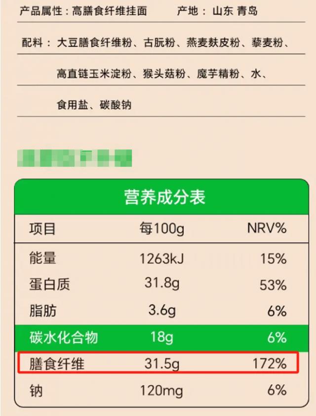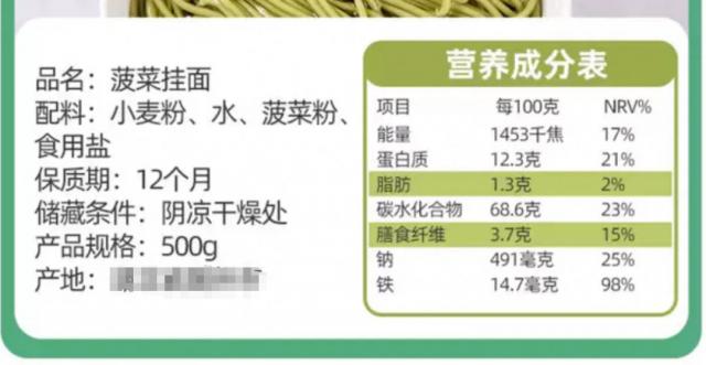图片:一个品牌的菠菜面,膳食纤维和铁含量还不错。