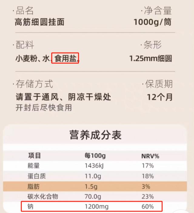 例如下面这个,钠含量高达 1200 mg /100 克,这意味着吃 100 克面,将近距离摄取 3 克盐,已占每日盐摄入量的比例。 60%。很多人在吃面条的时候都要配上咸卤,这顿饭的盐摄入量更高,所以很难保持《中国居民膳食指南》推荐的全天盐摄入量。 5 克以内。经常食用这种面条,对心血管健康不利。