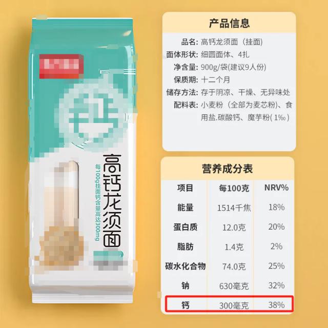 例如下面这个加强钙的面条,吃。 100 克面可以增加 300 摄取毫克钙,可以满足普通人每天对钙的需求。 38%,还是挺好的。