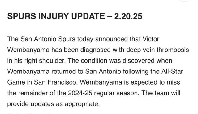 圣安东尼奥的夜色浑浑噩噩,马刺未来之星维克托托 · 全明星赛后,文班亚马返回球队,却迎来了一个大家都不愿意听到的消息——右肩深静脉血栓,赛季报销。马刺的官方声明就像一颗炸弹,瞬间在联盟中引起振动。