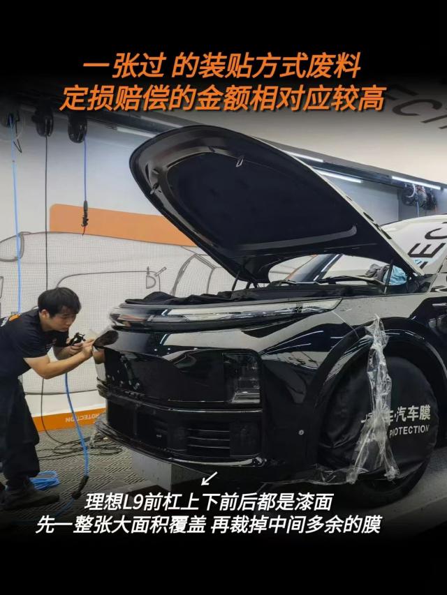 比如L9的前杠,前后左右都是油漆表面,中间格栅不能贴车衣。为了更加隐形美观,我们选择了一种贴法。也就是说,用一整件大面积的车衣覆盖,然后切掉中间多余的薄膜。实际材料多,成本高,固定损失赔偿金额也相对较高。