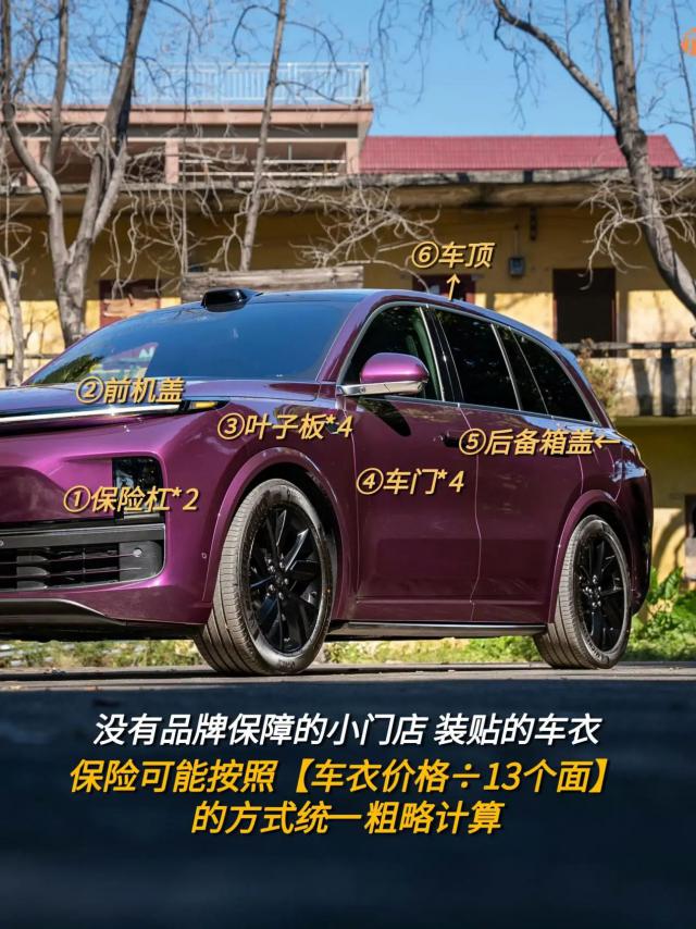 如果是贴在没有品牌保障的小店的车衣,由于车衣实际价格难以追溯,保险公司可以根据市场价格将车身划分为13个面,根据[车衣价格÷13]方法粗略计算,无论损坏位置的油漆表面有多大,都是相同的赔偿标准。