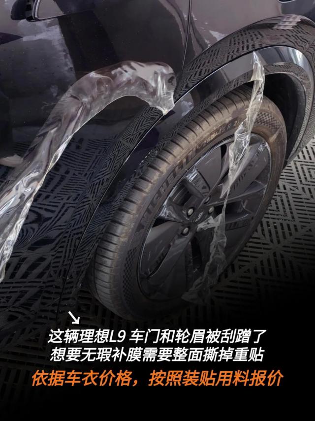 和这个理想的L9一样,车门和轮眉都被摩擦了。无论车衣实际损坏多大,如果想要无瑕补膜,需要撕下整块重贴。所以对方的保险需要赔偿这两面的车衣,赔偿费用是根据装贴的车衣价格和贴膜店的补膜价格来计算的。