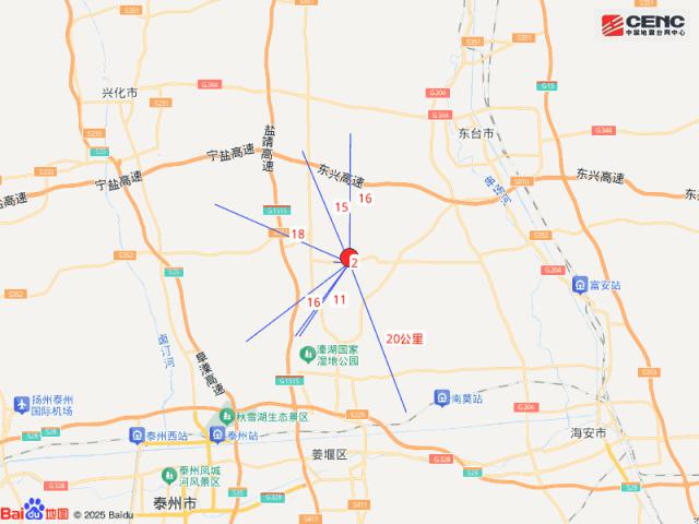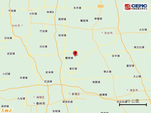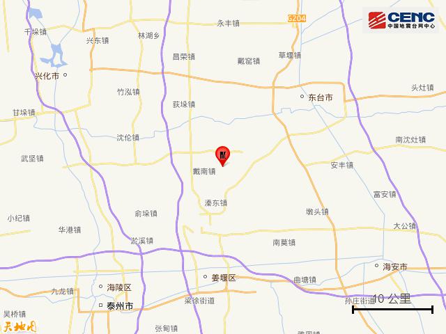 3.7级地震发生在江苏泰州市兴化市。