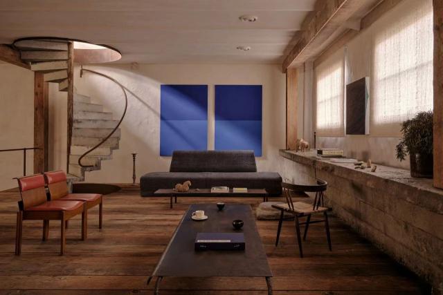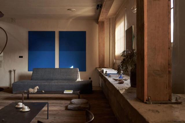 用旧地毯做的沙发,用一系列架子上的艺术作品和家具建造剩余的油漆、多层板和钢板...在这里听一些黑胶音乐,沐浴在从三楼射下的光线中,很舒服。
