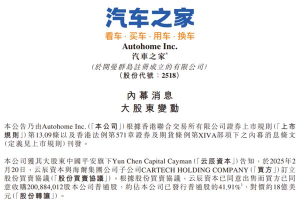 汽车之家在香港证券交易所发布公告称,该公司被其大股东中国安全旗下云辰资本告知,云辰资本与海尔集团公司子公司当日 CARTECH HOLDING COMPANY(卡泰驰)签订股权买卖协议。