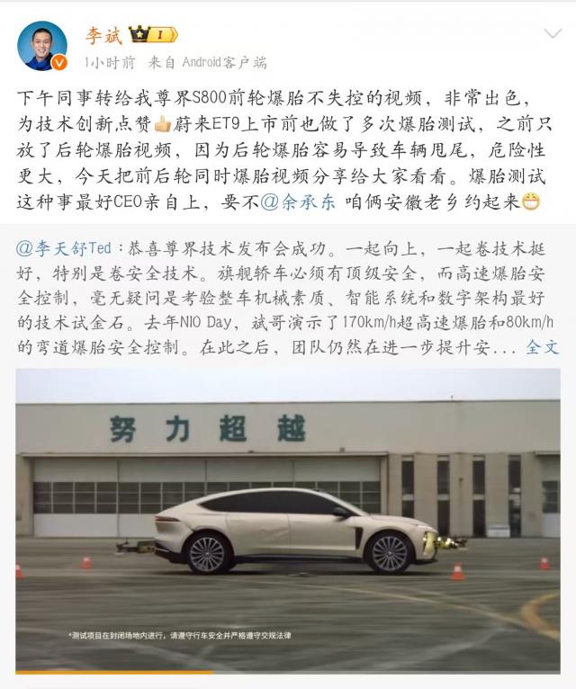 余承东在新闻发布会上称赞蔚来。 ET9 对于后轮爆胎的检测,同时展示尊界 S800 行业首个 120km/h 前轮爆胎不失控。