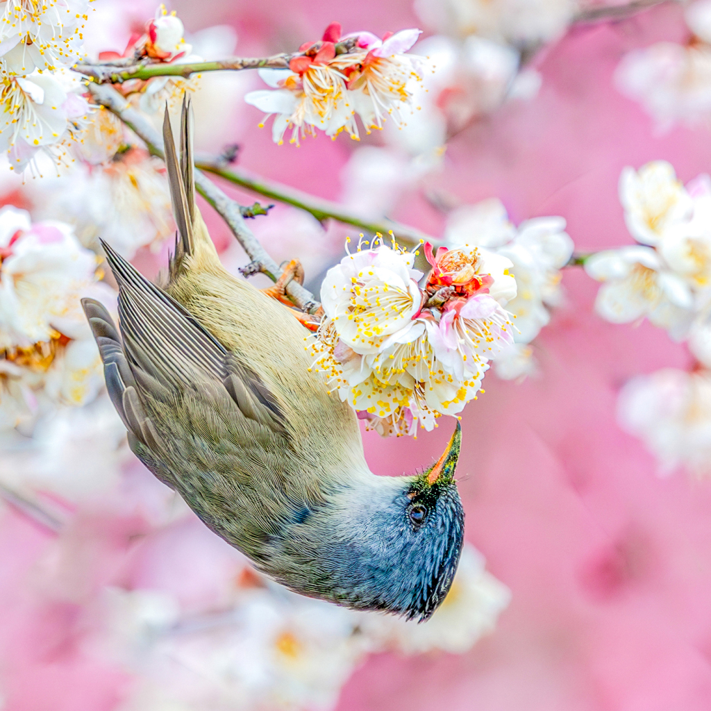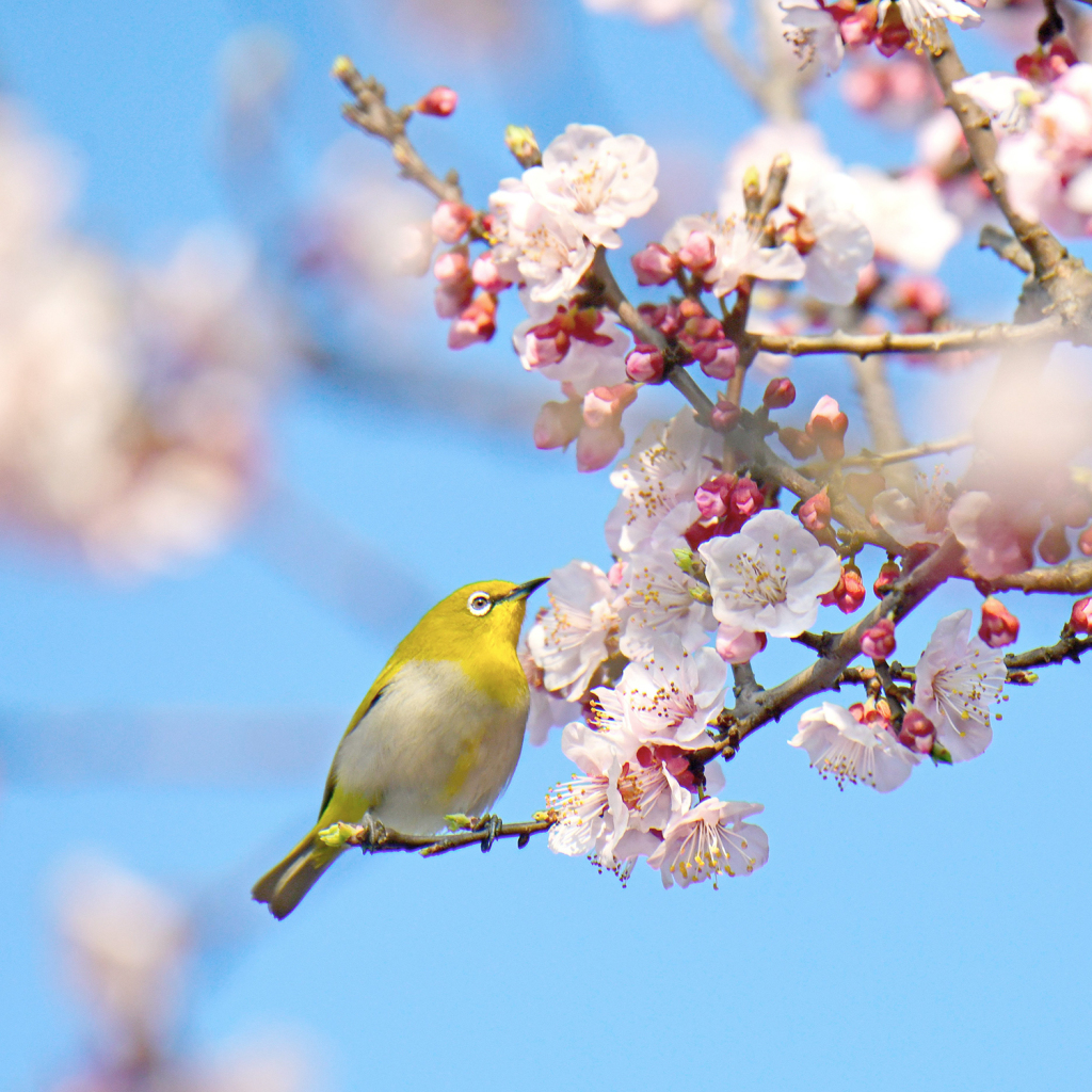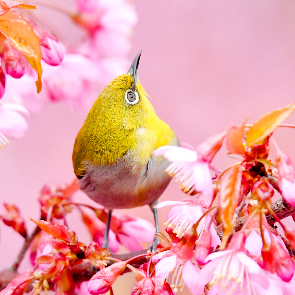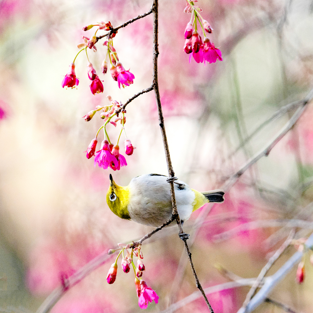 武汉,绣眼萌鸟于2025年2月19日在武汉大学与盛开的早樱“争春”。黄锋/视觉中国 图
