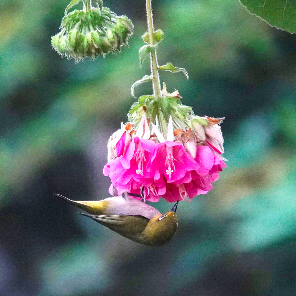 2025年2月15日,在广西南宁市人民公园的非洲芙蓉花园里,鸟儿倒立在一朵盛开的非洲芙蓉花上寻找食物花蜜。湘泉/视觉中国 图