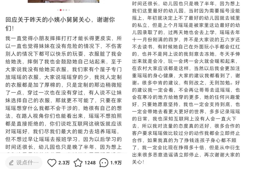 很多网友的不满迅速蔓延。瑶一瑶视频中冻红的双手和流鼻血的场景再次引发热议。网友再次提问:“为什么孩子在这么冷的天气里在户外拍新年视频?”