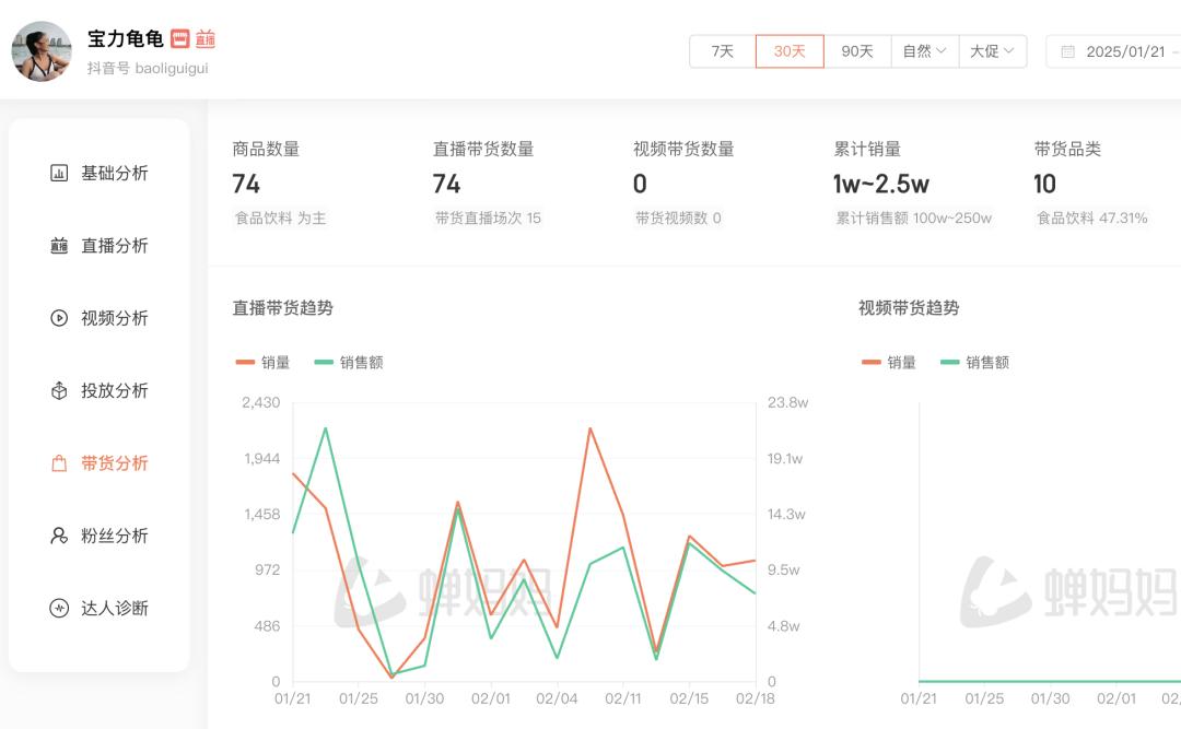 以SASA球妹和宝力龟账号为例。除了广告和视频植入,他们的父母都建造了一个带货的直播室。SASA球妹的商业实现直接转移到了“我是球妈”的账号。同时,根据蝉妈妈的数据,宝力龟在过去30天内带来了15次商品,累计销售额达到100万-250万。其商品类别主要包括食品、珠宝、厨房和卫生电器等。以此为平均值,仅仅是带货方的年收入就有望超过300万。