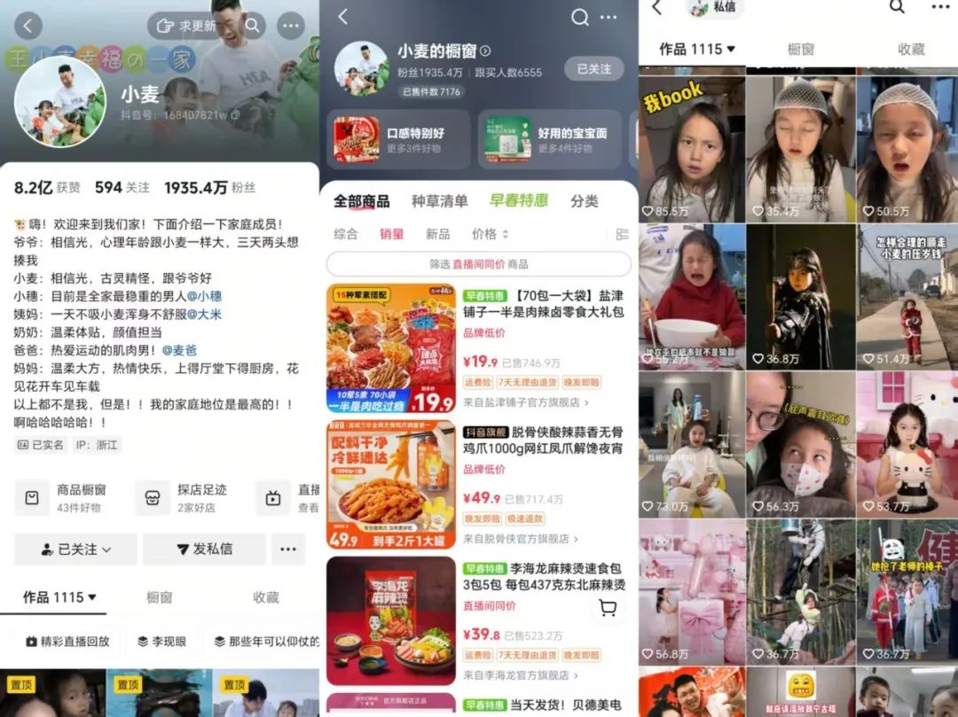 同样年仅四岁吸粉数千万的萌娃网红“麦子”,目前在抖音账号粉丝已达1935.3万,王小麦的视频风格也是以搞笑的日常分享为主,依靠脑回路异常的表现,而且非常社牛的表现力,还有兴趣爱好丰富的日常生活片段,王小麦也被很多网友视为“国民闺女”。、因特网闺女。