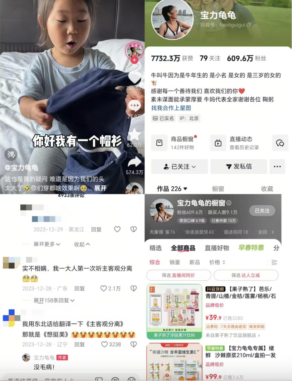 另外一类是“天才儿童”系列,比如三岁萌娃“小牛”,以“我有一件帽衫”风靡全网,目前其抖音账号“宝力龟龟”已有609.7万粉丝。三岁时,他的逻辑思维能力超过了同龄人。他被很多网友称为“孩子姐姐”。在“宝力龟龟”的视频中,他展示了一个在精神养育下长大的高智商天才儿童。组织清晰、词汇量惊人的回答把他捧在了“互联网导师”的高位,让很多成年人感叹不如。比如在其中一个视频中,小牛甚至在吐槽父亲时提到了“主客观分离”的概念,震撼了很多网友。
