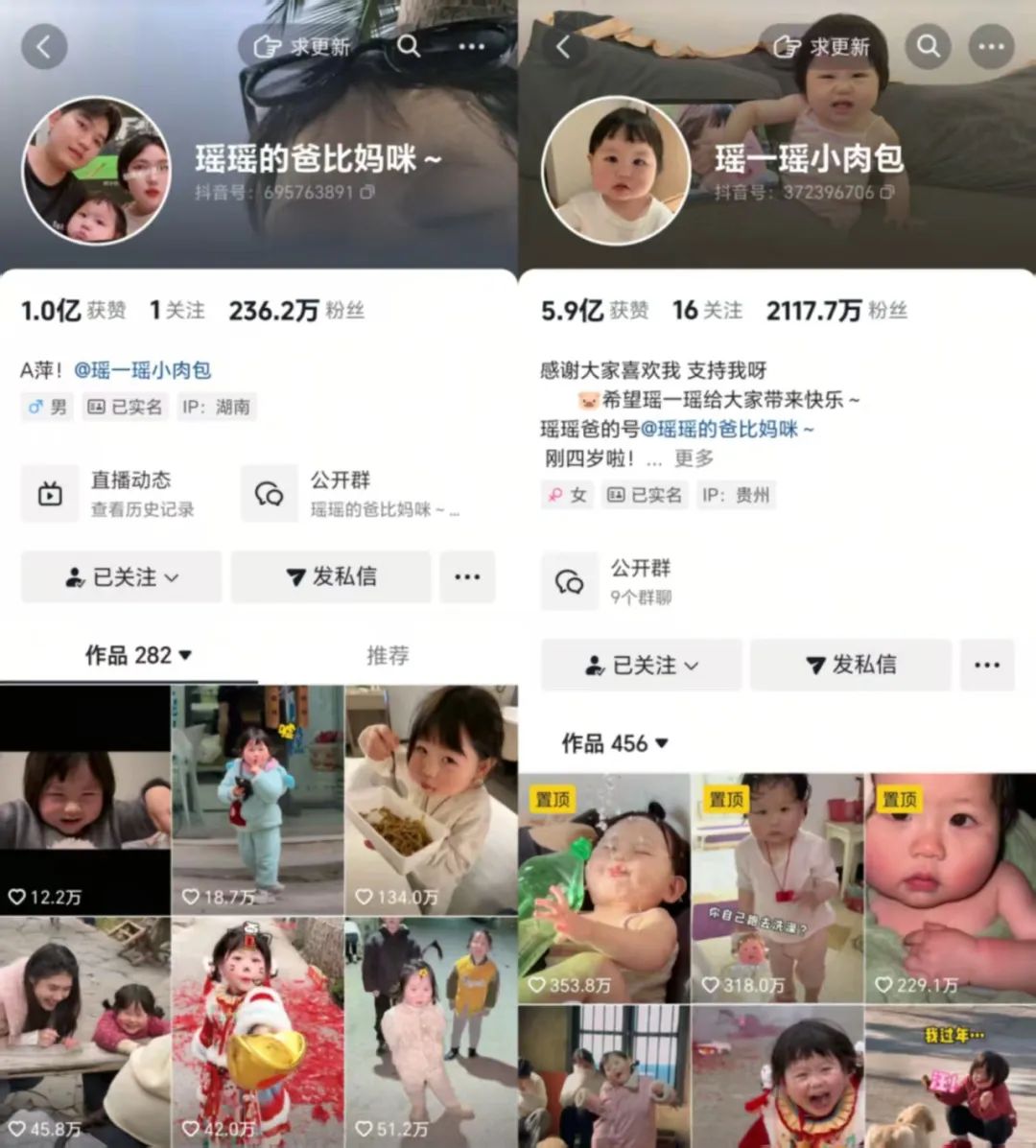 目前,瑶一瑶有两个抖音帐号,一种是“瑶一瑶小肉包”,拥有2117.9万粉丝,另一种是“瑶瑶的爸爸比妈咪”,粉丝数量为236.2万。,两个账号的内容主要是记录瑶瑶的日常生活。“瑶瑶的爸爸比妈妈好”账号偶尔会和父母家人分享一些大拍摄的“花絮”和日常生活。