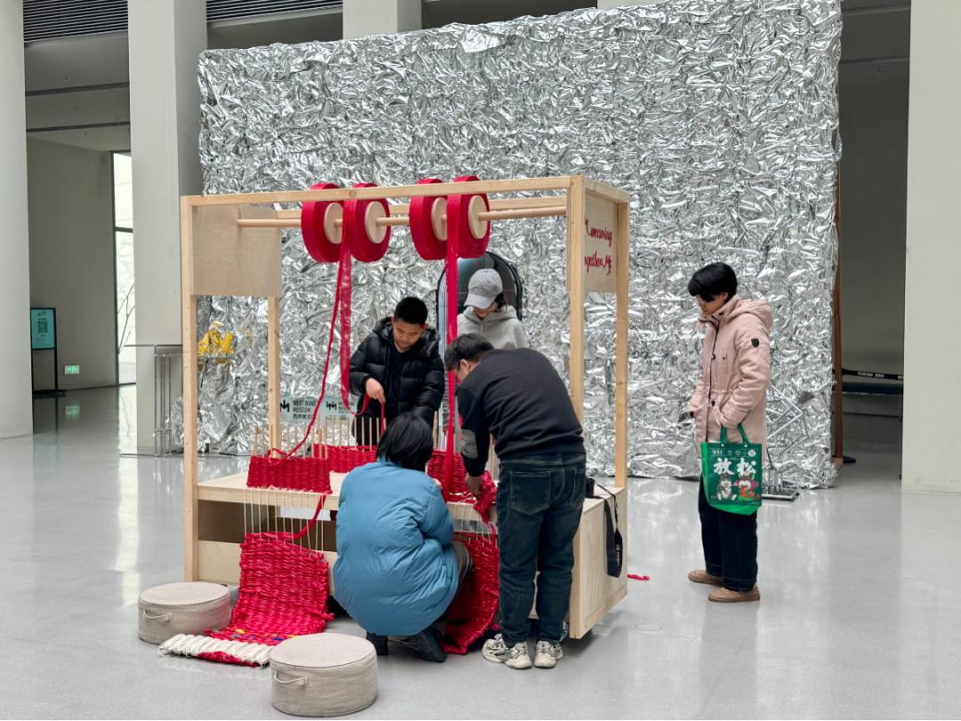 步入美术馆中庭,近十台色彩鲜艳的可移动织机错落有致,像巨型乐高积木一样的编织基站成为空间的视觉焦点。有些参与者说:“我刚从办公室来,迫不及待地想参加这次活动。它看上去非常自然,非常放松,是一种非常原始的艺术创作方法。“编织导航”的互动墙前,挤满了跃跃欲试的市民。有亲子家庭一起尝试,勾选自己喜欢的编织图案;有外国游客用翻译软件扫描二维码了解项目理念…