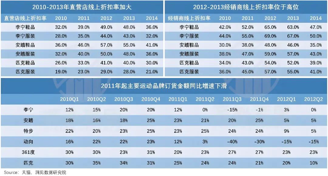 因此,从2010年到2013年,各品牌的折扣力度不断加大,最高折扣率甚至达到69%。然而,这样的让步并没有打动消费者。各大运动品牌库存周转率较高,订单金额同比下降。