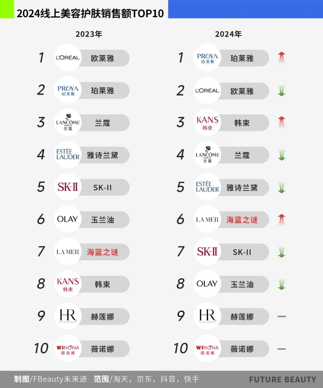 从FBeauty未来迹整理的2024年线上美容护肤品销量Top10品牌可以看出,除了国产品牌,排名上升的品牌是以海蓝之谜为代表的“顶级奢侈品”品牌。