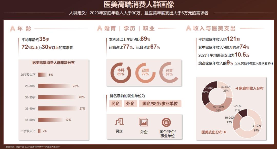 根据德勤发布的《2024年中国美容行业洞察报告》,医疗美容高端消费者的定义是“2023年家庭年收入超过30万元,医疗美容年支出超过5万元的需求方”。这些人的平均家庭收入约为121万元,2023年医疗美容平均支出为10.5万元。