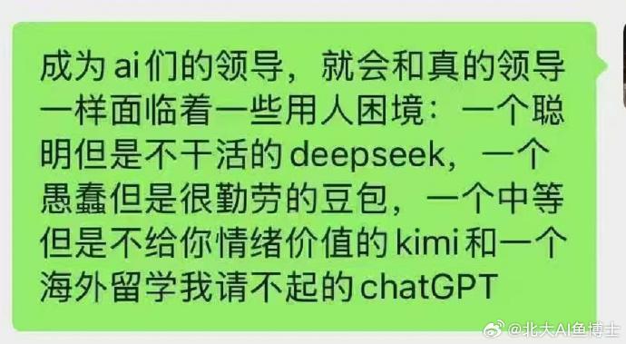 虽然网上流传的段子略带戏谑,但也真实地反映了AI在内容生成上的效率优势:“我新招聘了。 4 每个员工,都是 7*24 他们是ChatGPT小时工作系统、DeepSeek、豆包、Kimi。”
