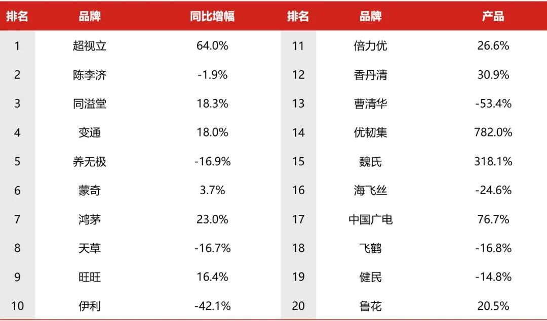 在2024年视频广告成本前20名的品牌中,品牌表现方面,药品行业品牌占比达四成,同类产品涵盖饮料、食品、酒精饮料等七个行业。列表六成该品牌加强了电视广告投放,其中超视立、优韧集、魏氏、中国广播电视等多个品牌的广告费用增长显著。