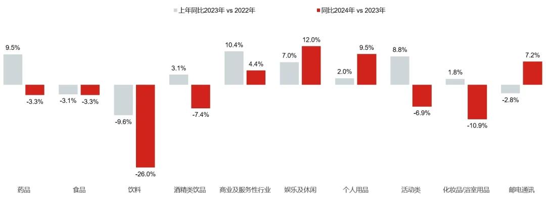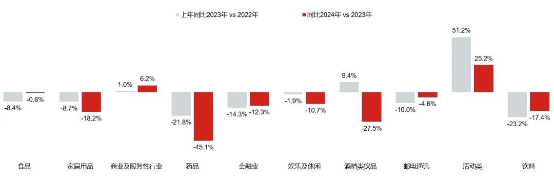 在电视渠道中,药品、食品、饮料和酒精饮料的数量一直处于领先地位。其中,饮料行业广告营销量同比下降超过25%,而且药品、食品、酒精类饮料行业的广告刊例费用同比下降均保持在个位。