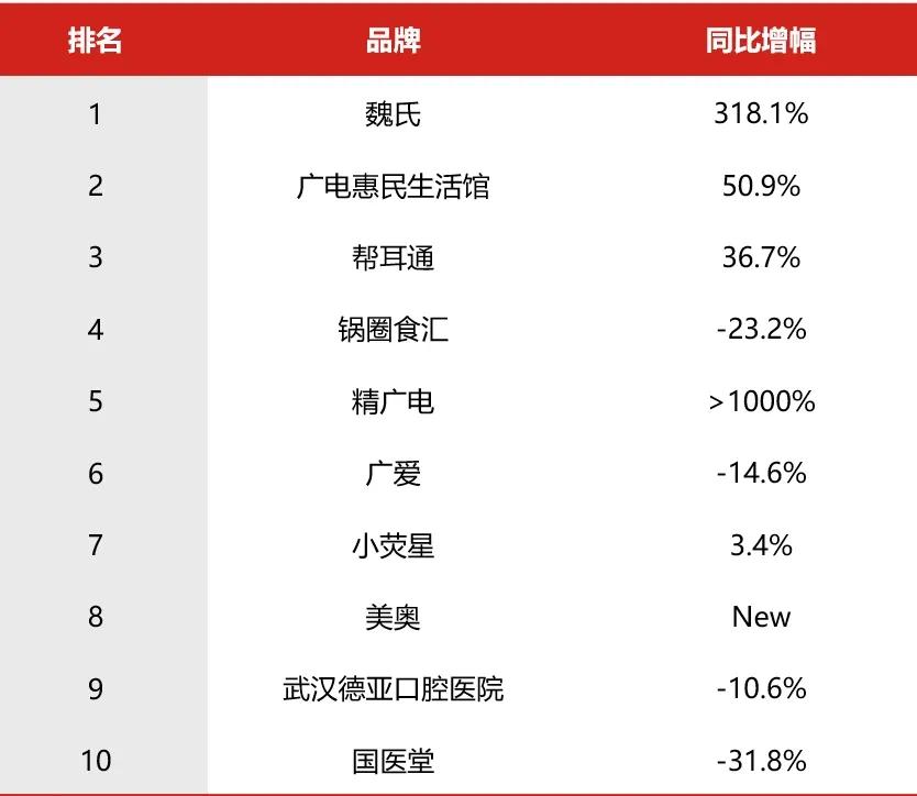 在商业和服务行业中,医疗/保健机构类别它已经成为这个行业视频广告的主要增长来源。尽管整个零售服务类别6.5%广告投资有所减少,但电视渠道百货零售服务和家电零售服务的宣传推广力度有所加强,广告费用分别同比增长。2.7%和76.7%。在这个行业中表现突出的品牌包括魏氏、广电便民生活馆、帮耳通、精广电、小荧星等。