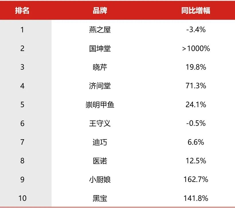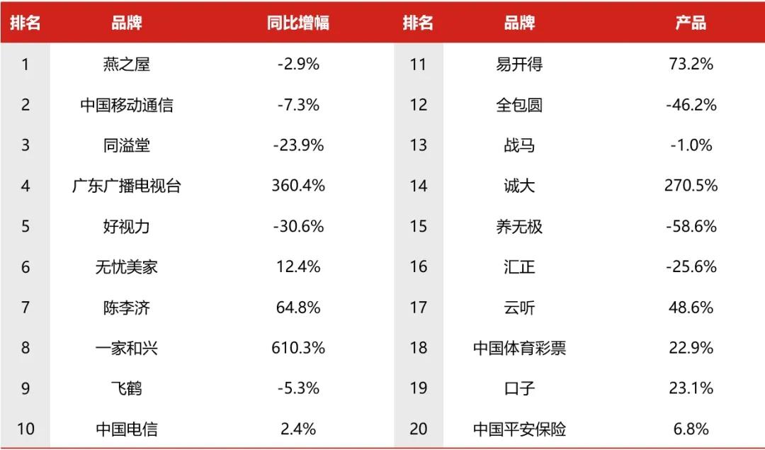 虽然食品行业整体投放量较大,但受肉类、粮食、食品、企业形象等品类广告营销减少的影响,整个行业在广播渠道的出版成本同比略有下降0.6%。但是,保健食品和调味料两大类增加了广播广告营销,费用同比分别增加。3.1%和12.2%。排名前五的品牌包括燕之屋、国坤堂、晓芹、济间堂、崇明甲鱼。