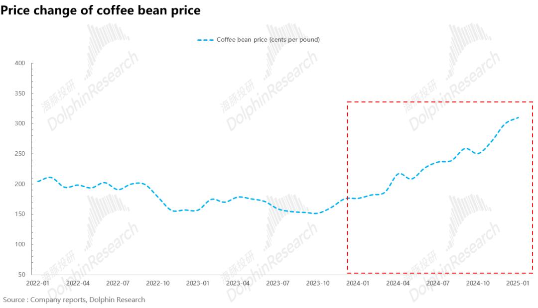 1)逆势降价,减少加盟商回到本周期。原料方面,自2024年初以来,受极端天气影响,巴西和越南的两大咖啡豆主要产国都面临着大幅减产,咖啡豆产量低于预期,导致咖啡豆价格全年飙升70%以上。然而,瑞幸宣布,自2025年1月以来,加盟商从瑞幸购买的咖啡豆价格下降了16.8%。此外,椰奶、纯牛奶等其他86种原料也有所下降。