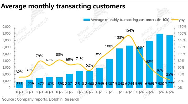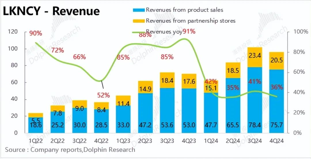 Q4瑞幸实现总收入96.1亿元,同比增长36.1%,略超预期(市场预期95.6亿元)。从拆分业务来看,直营收入为76亿元,仍为40%。 在高速增长中,但是由于加盟重点地区针对库迪,对加盟商给予了大力补贴。,利润仅仅勉强超过20亿,同比增长仅为16%。