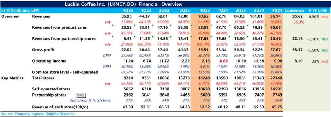 瑞幸咖啡(LKNCY)2024年第四季度财报(截至2024年12月)于北京时间2025年2月20日下午在美股市场前公布,在营收略超预期的基础上。核心经营利润大超市场预测,其背后的本质在于瑞幸开店速度放缓后店铺运营效率的提高。,具体而言,核心信息:
