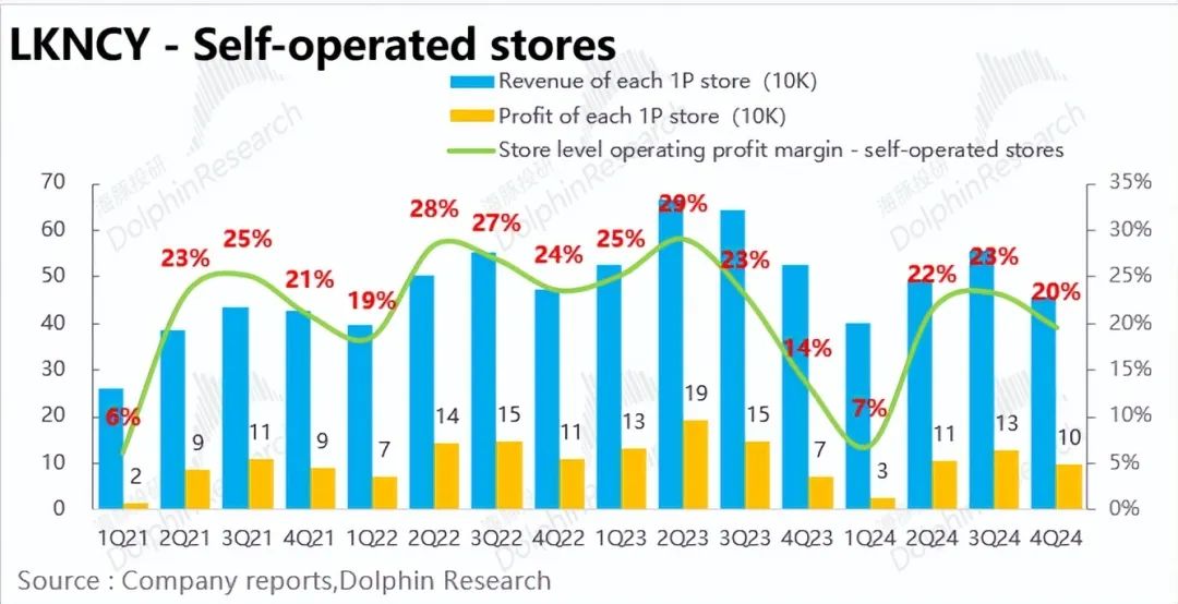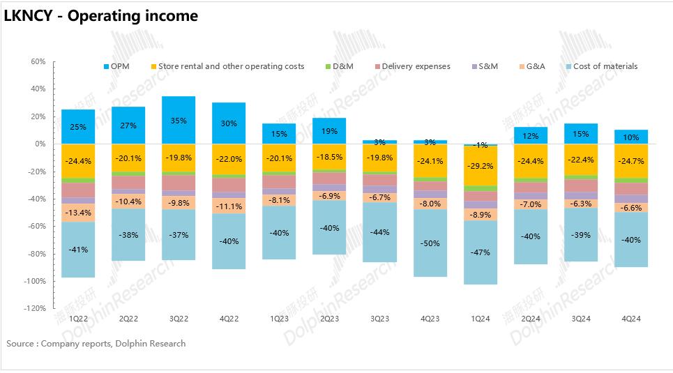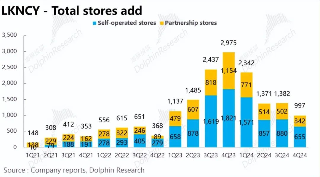 从开店数量来看,瑞幸24Q4比Q3净新增997家门店,其中自营门店/加盟店净新增655家/342家,增速比Q2高。、Q3持续放缓,接近2023年价格战前的水平(为应对库迪的9.9价格战) 高速度开店,瑞幸在2023年加快了开店速度,占据了高质量的位置),侧面证实了库迪对瑞幸的威胁在不断减弱。。