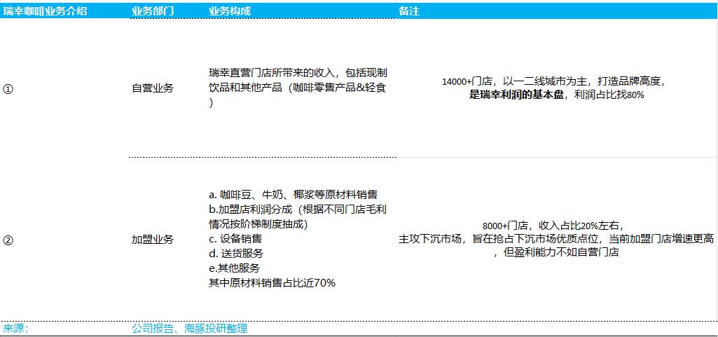 加盟业务的利润包括:原料(咖啡豆、牛奶、椰奶)销售给加盟商、加盟商的利润抽取(根据不同店面的毛利情况,按台阶制度抽取)、设备销售、送货服务和其它服务五个部分,其中,原材料销售占比接近70%,是加盟业务的核心收入来源。目前有8000多家加盟店,营收占20%左右。主要集中在三四线等下沉市场,旨在占领下沉市场的优质点。,尽管目前加盟店开店速度较快,但是盈利能力不如自营店。