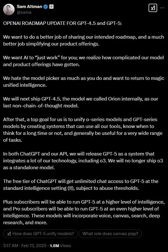 值得注意的是,OpenAICEO萨姆·奥尔特曼于2月13日凌晨发布了GPT-4.5和GPT-5的最新消息。奥尔特曼宣布,OpenAI将在未来几个月内推出一款名为GPT-5的模型,该模型将整合包括o3模型在内的大量OpenAI技术,并将其应用于聊天机器人ChatGPT和API平台。此外,更重要的是,免费版本的ChatGPT可以在标准智能设置下与GPT-5进行无限对话。