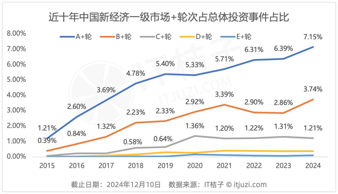 在众多的「 轮」中,A 轮子一直是投资事件最多的轮子。2015 年仅发生 126 投资事件,比例 1.21%,之后逐年增加,直至 2024 年发生 407 投资事件,比例达到 7.15%。