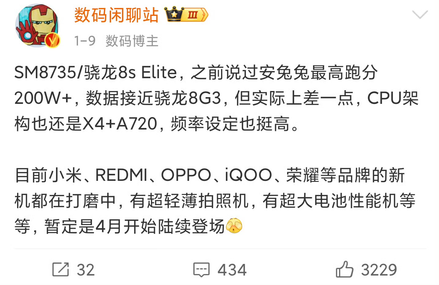 数字化聊天站透露,高通骁龙8s Elite预计将于4月份出现,就像上一代一样,由小米Civi系列新机首发,或者是小米Civi5 Pro。不只是小米,第一批搭载骁龙8s Elite还包括一款新的旗舰机型,配备6000毫安时主推长续航,以及一款7500毫安时大容量的中端机型。