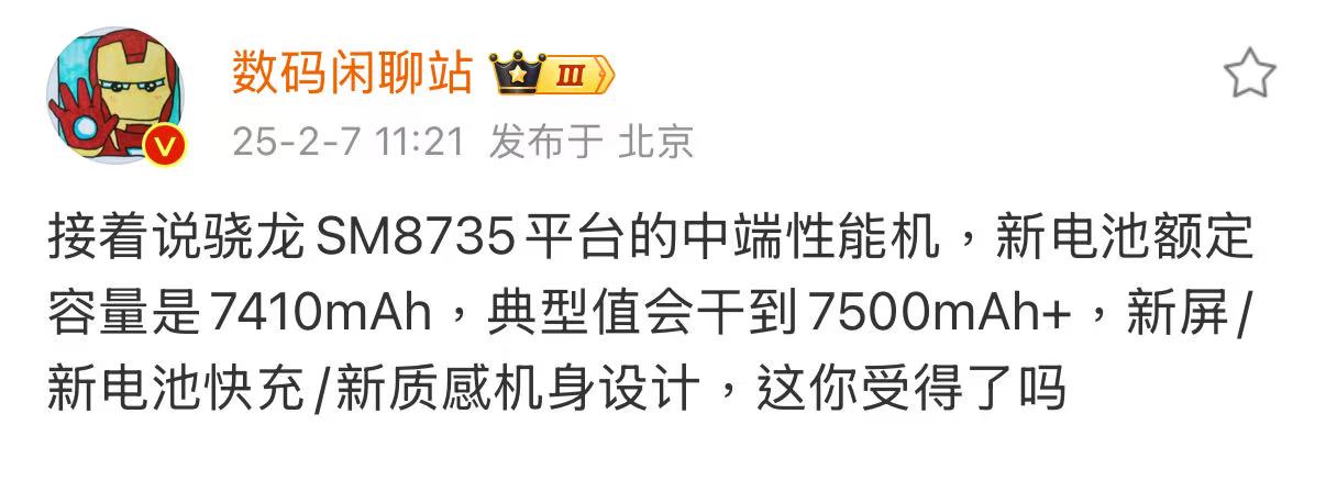 然而,目前已经曝光了第一批搭载骁龙8s 就Elite移动平台的型号而言,应该是主推超长续航的型号。数码聊天站的爆料显示,甚至小米Civi5 Pro都上了6000毫安时的大电池,更不用说7500毫安时的机型了。