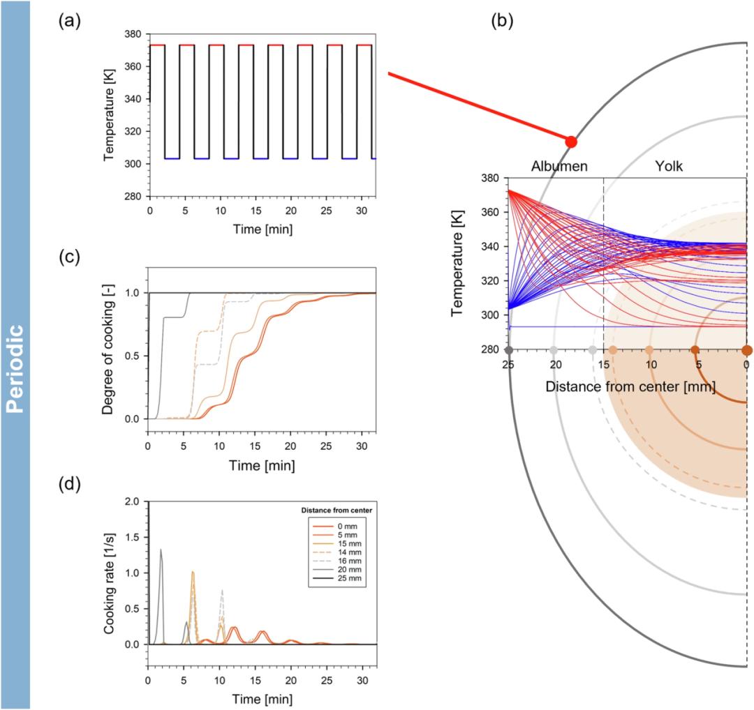 定期烹调方法煮鸡蛋的模拟结果:a施加定期时变化的初始条件(即在不同水温下保温的特定时间);温度分布随着时间的推移而演变;c随着时间的推移,在离鸡蛋中心不同距离的地方烹饪;d 随着时间的推移,在离鸡蛋中心不同距离的地方烹饪速度[1]