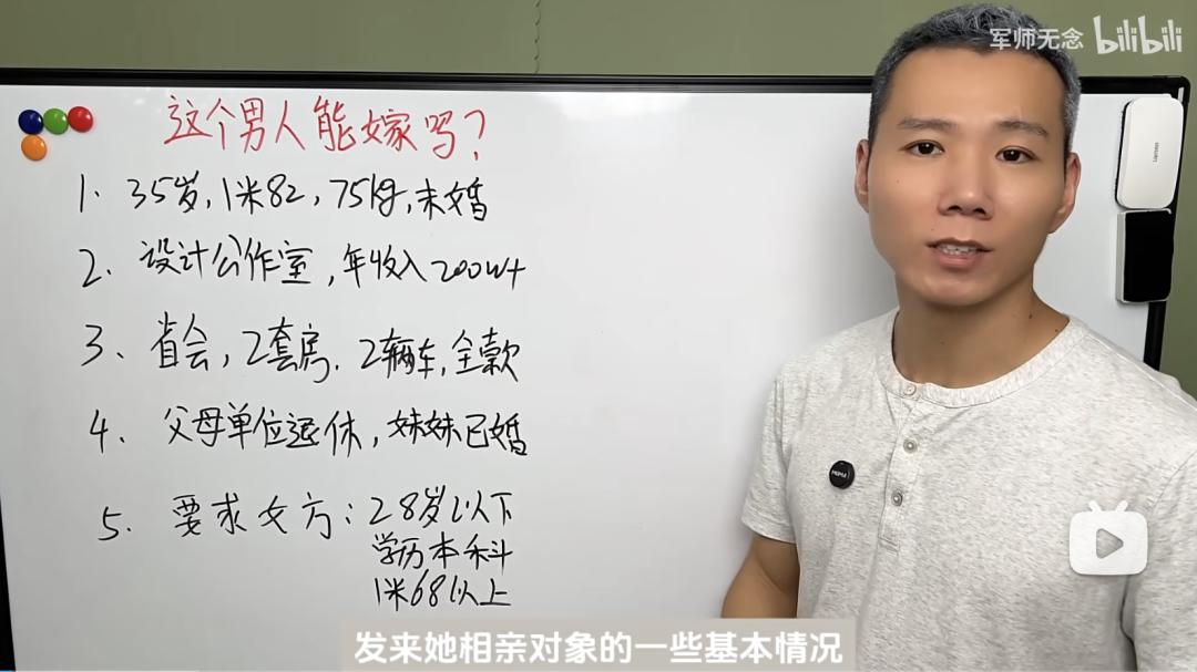 相亲分析师从身高、年龄、文凭、职业、家庭、三观等方面,先放置数据,再下结论,用“白板教学” 帮助网友分析“这个男人/女人可以结婚/结婚吗?”即时连麦。