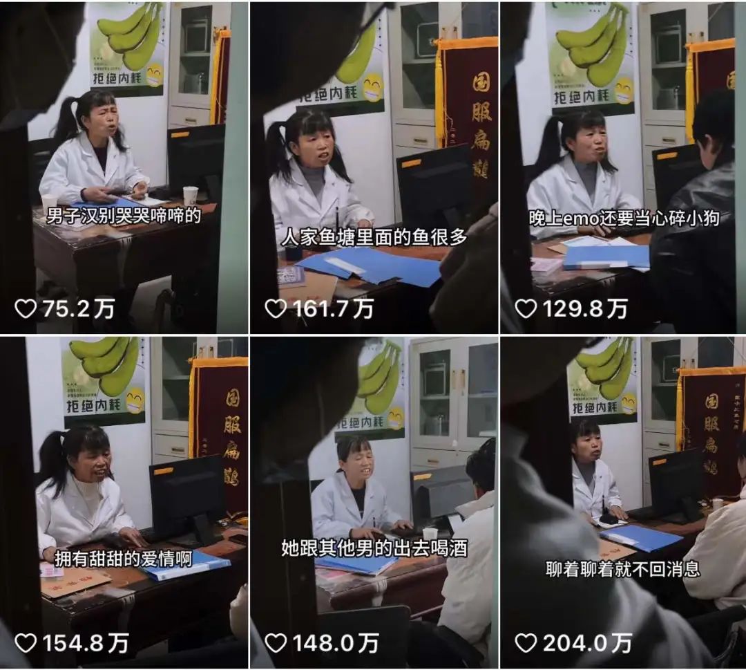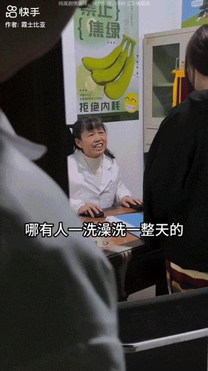 视频中,“霞士比亚”身穿白大褂,梳着特色的双马尾发型,在出诊时扮演心理医生的角度,配合门口第三方的拍摄角度,不时让路人发笑,生动地展示了一系列吃瓜剧,看热闹不算太大。